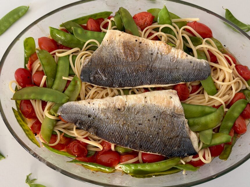 מניחים את פלטי הדג עם העור כלפי מעלה על גבי תערובת הירקות ואופים כ־15 דקות, עד שעור הדג קריספי והעגבניות צלויות ומתרככות. במקביל מבשלים את הפסטה לפי הוראות היצרן, שומרים כחצי כוס ממי הבישול.